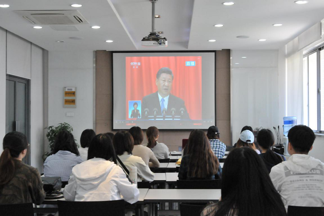 学生代表认真观看习近平总书记纪念马克思诞辰200周年大会直播