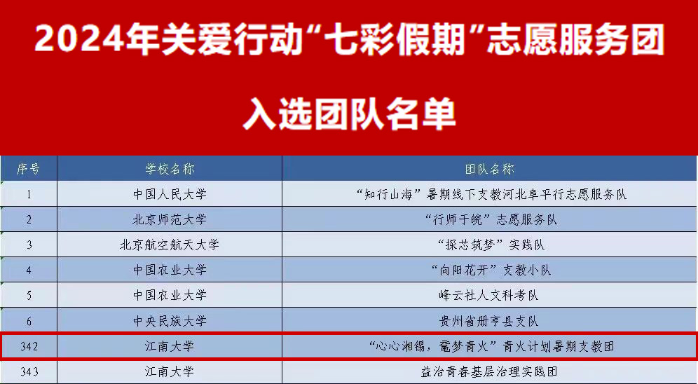 “青火计划”暑期支教团入选团中央中国大学生知行促进计划,同时入选团中央2024年关爱行动“七彩假期”志愿服务团,团队将于7月中旬赴湖南省株洲市水口镇中心校开展志愿服务活动。