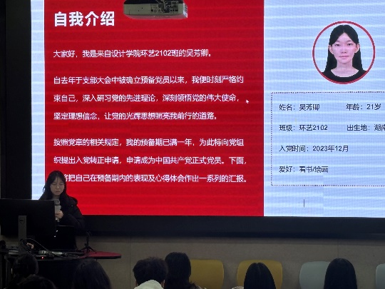 会上,王唯首先介绍了2024下半年拟转正预备党员的相关情况,接着由预备党员依次进行答辩汇报。预备党员们本着实事求是的原则,结合自身经历向党组织汇报了自己在预备考察期内思想、学习和工作等方面的成长与不足之处。他们中有的在本科四年内斩获A、B类设计竞赛奖项20余次,代表学校在国内乃至国际上崭露头角,展现设计风采;有的投身于实践活动,共参加13项校级及以上社会实践活动,并累积志愿时长超380小时,真正走进社会,走近民众;有的曾担任团支书,工作认真负责,高效完成党组织交给的任务,并组织参与社区调查公共服务等10余项活动。他们表示,未来也将继续按照党员的标准严格要求自己,不忘初心、牢记使命,继续在学习、工作和生活中发挥先锋模范作用,为党的事业添砖加瓦,努力做一名优秀的共产党员。