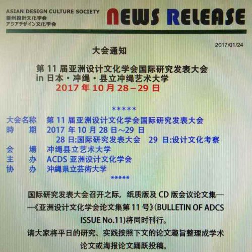 2017年度的ACDS大会的会议论文征集已经正式启动,国际研讨会将于10月28-29日在日本冲绳举行,由冲绳县立艺术大学承办,期待各位会员朋友一如既往的支持本学会的发展,积极投稿,踊跃参加国际研讨和交流。 会议论文的征集流程和往年一样,首先征集论文摘要,请有意参会的作者于2017年3月31日前填写论文摘要,并发送至中国分[…]