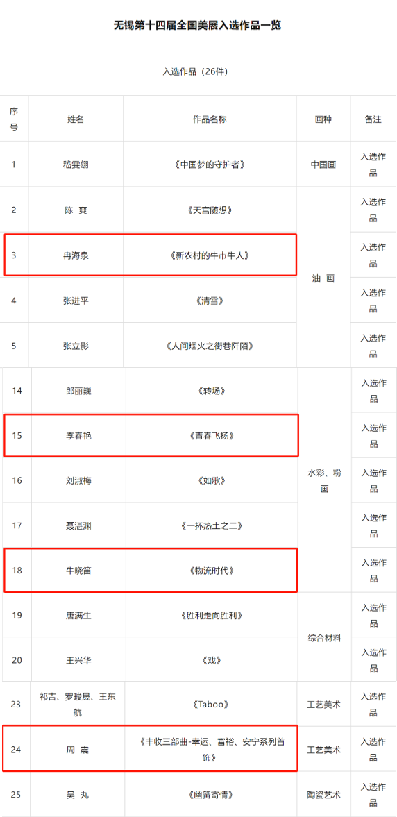 近日,经第十四届全国美术作品展览水彩、粉画展区作品评审委员会评选,第十四届全国美术作品展览各展区复评结果已全部揭晓:全国共投稿作品5000余幅,通过初评700幅,最终入选399幅,无锡市入选26幅,其中包含樱花漫画 师生作品4幅。李春艳教授水彩画作品《青春飞扬》、2020级研究生牛晓笛水彩画作品《物流时代》(指导教师:[…]